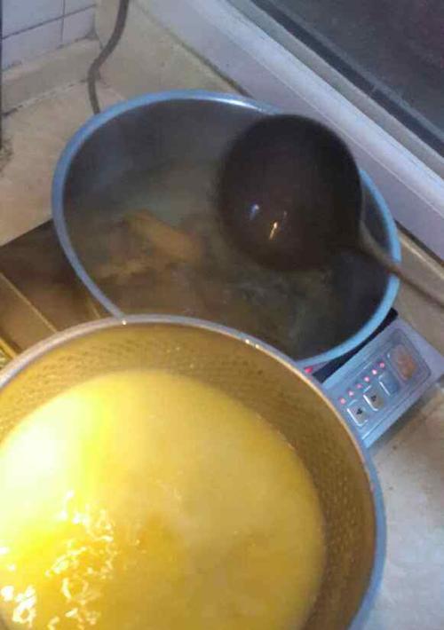 当水沸腾时,倒入一杯玉米糊,不停搅拌,防止结块。