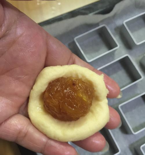 2.将豆沙馅小球放置于面皮中心。