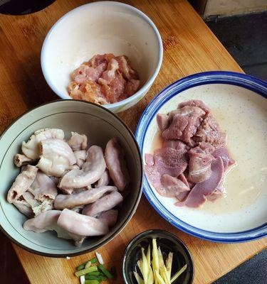 一、准备食材:新鲜鱼肉、猪杂、芥菜、鸡蛋、淀粉和调料。