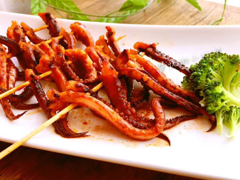 5:烤好的鱿鱼须,可以根据自己的口味撒点孜然更好吃哦