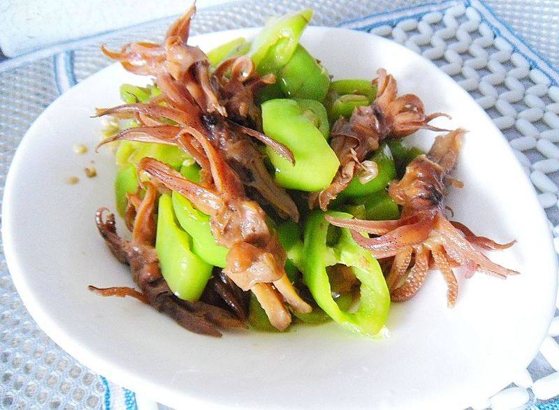 1:主辅料:鱿鱼须、尖辣椒把干品鱿鱼须提前泡发洗净。