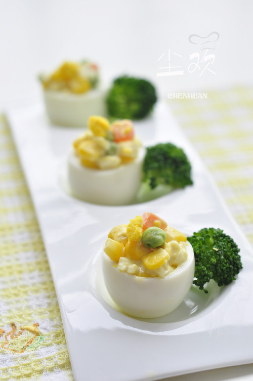 鸡蛋三个;玉米粒适量;豌豆粒适量;西兰花适量;