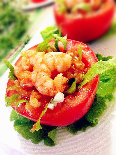 17:最后将炒好的虾仁码入番茄盅内,剩余的酱汁浇入盅内即可享用哦