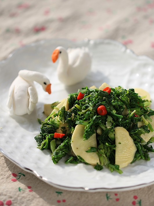 1.焯春笋时一定要冷水下锅去除其涩味;而焯荠菜时先要加入点盐和油,这样焯过后能保持蔬菜的翠绿;2.先炒春笋,由于它不易炒熟,可以加入少量的水煮一下;煮到九成熟时,再加入荠菜一起翻炒;出锅前加入盐调味;3.加入点红辣椒圈主要是为了点缀,也能去除春笋的涩味,但不要加太多,以免盖压荠菜的鲜美味。
