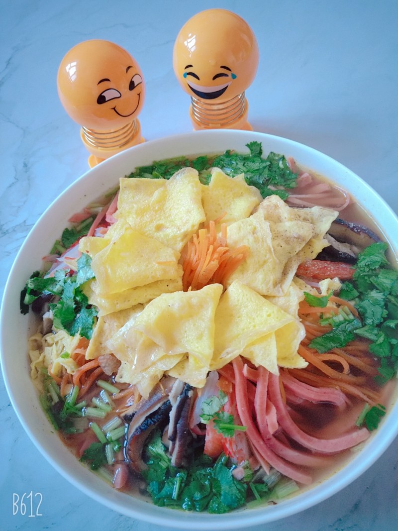 胡萝卜丝适量;香菇丝适量;鸡蛋皮和皮适量;蟹肉棒适量;香肠适量;香菜适量;