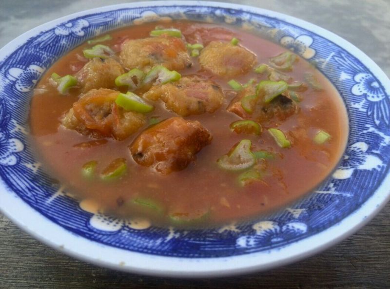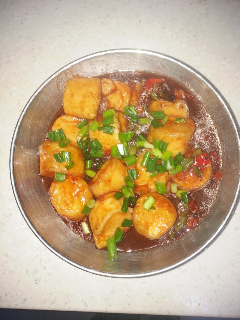 9:倒入炸好的玉子豆腐,并倒入酱汁提味増鲜。