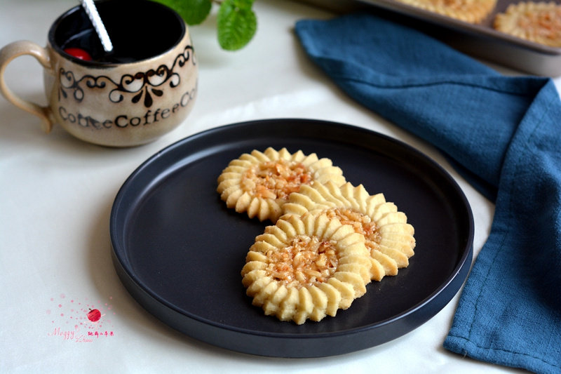 没有这种花嘴,可以用其它的裱花嘴挤成一个圆环状再填入内馅;杏仁粒是熟的,也可以用生的杏仁片来代替;赤砂糖又称金砂糖,还不同于我们平时用的红糖,烘焙店有卖。实在没有也可以用白糖替代;烤的时间和温度视自家烤箱和曲奇的大小薄厚来调整;刚烤好的曲奇内馅还处于粘稠状,要稍微凉一下再从烤盘中取出,这样才能使曲奇保持完整状态。