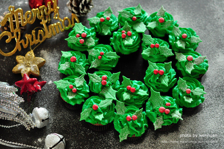 14:将绿色翻糖做成冬青叶,红色翻糖搓成圆珠装饰在蛋糕上。
