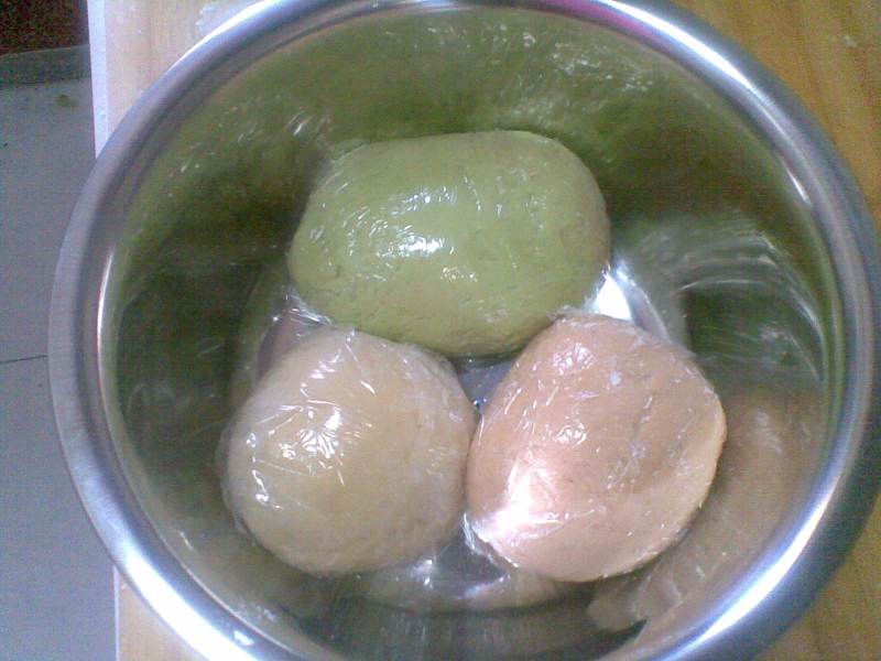 4:三种面团都发好了。到出排气。把发好的面团排气醒分钟