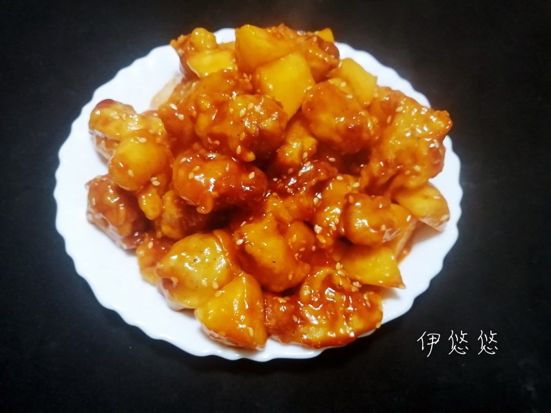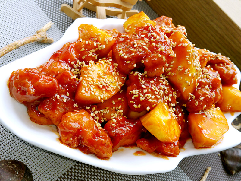 苹果糖醋肉是一道酸甜开胃的家常菜。选用猪里脊切条腌制,裹淀粉炸至金黄酥脆。糖醋汁是关键:锅中留底油,炒香葱姜,加入苹果丁略炒出果香,再调入白糖、米醋、生抽和少许番茄酱熬至浓稠。最后倒入炸好的肉条快速翻炒,让每块肉均匀裹上酱汁即可出锅。成品色泽红亮,口感外酥里嫩,苹果的清香完美化解油腻,做法简单,家宴待客皆适宜。