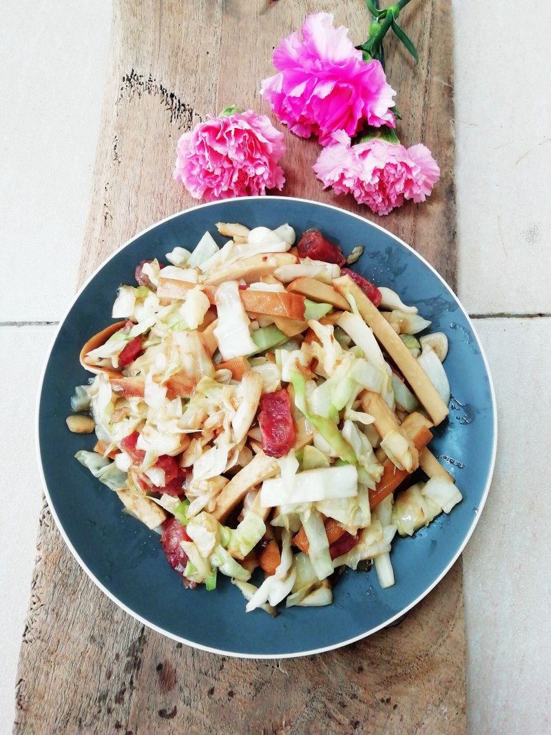 4:锅中热油放入腊肠炒出油之后,放入素鸡翻炒。