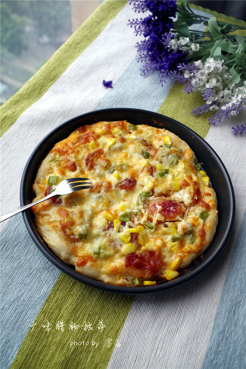 玉米油10g;广味腊肠1根;芝士90g;番茄酱5毫升;青椒0.5个;玉米2勺;
