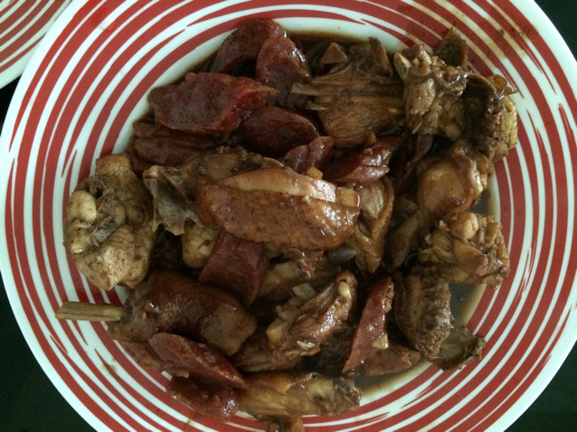 3:下油爆香蒜末和葱头。放入鸡肉炒香。加入腊肠,蠔油,生抽,水。煮沸转小火焖煮