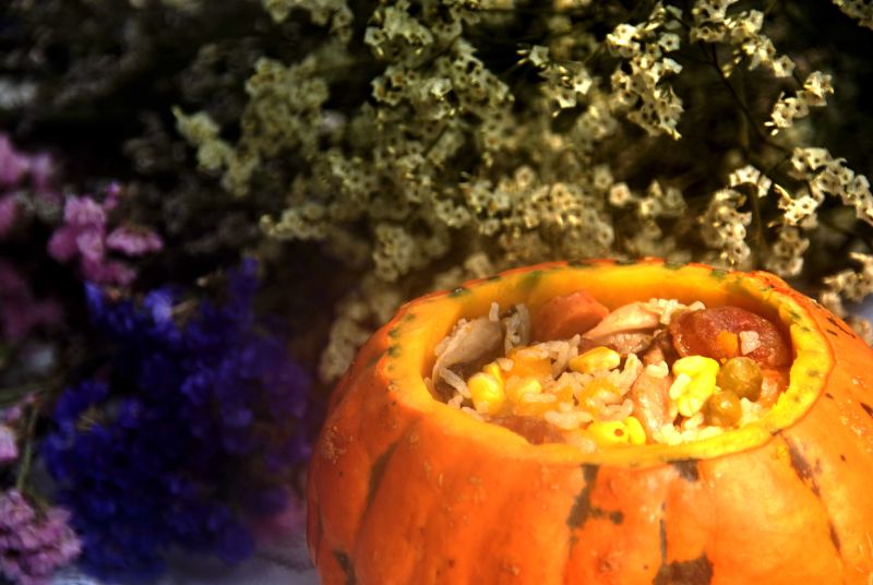 10:把煮好的饭装进南瓜,盖是南瓜盖子。