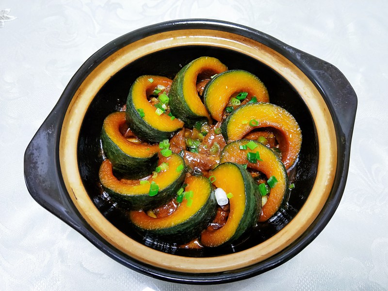 1:南瓜切开后挖瓜瓤,再切成小块。