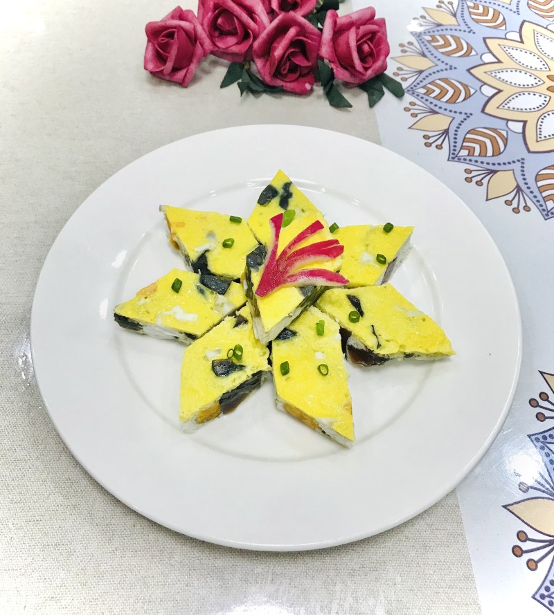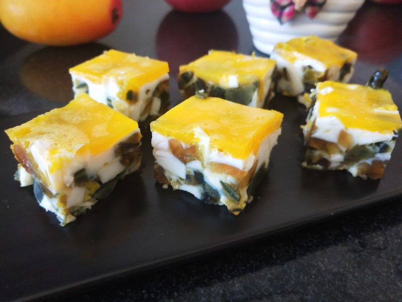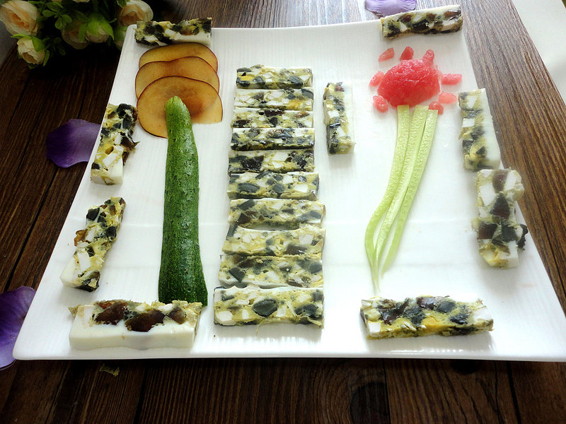 1:松花蛋、咸鸭蛋去壳,用线切小块。