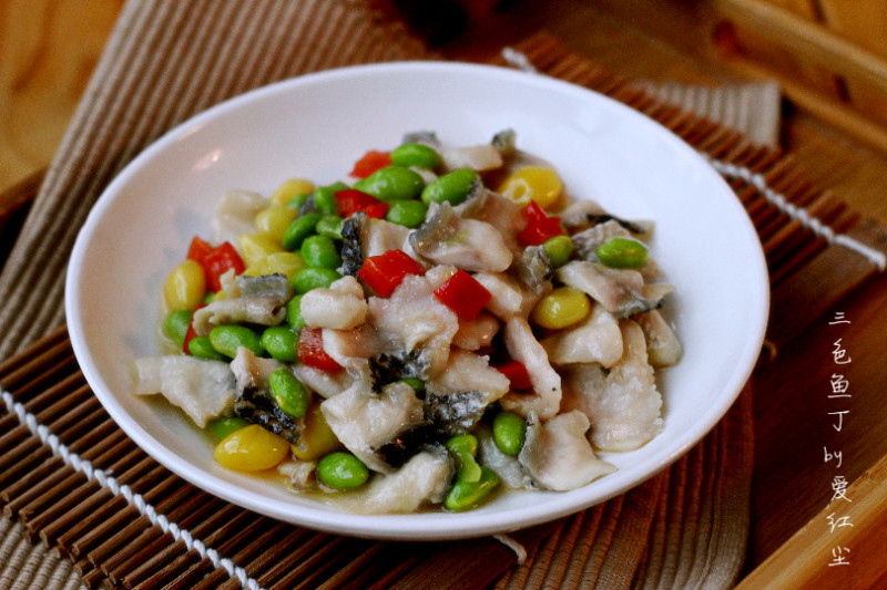 净鱼肉250克;白果15克;红椒50克;毛豆25克;