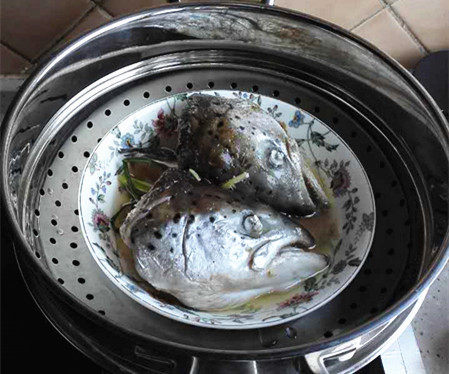 3:上锅清蒸:将锅放水烧开后,将鱼头放入碟中入锅清蒸,淋上食用油和胡椒粉。如有人喜欢蒸鱼豉油,可以淋上点,还可以放上点红辣椒丝(别太辣,主要为配色)。