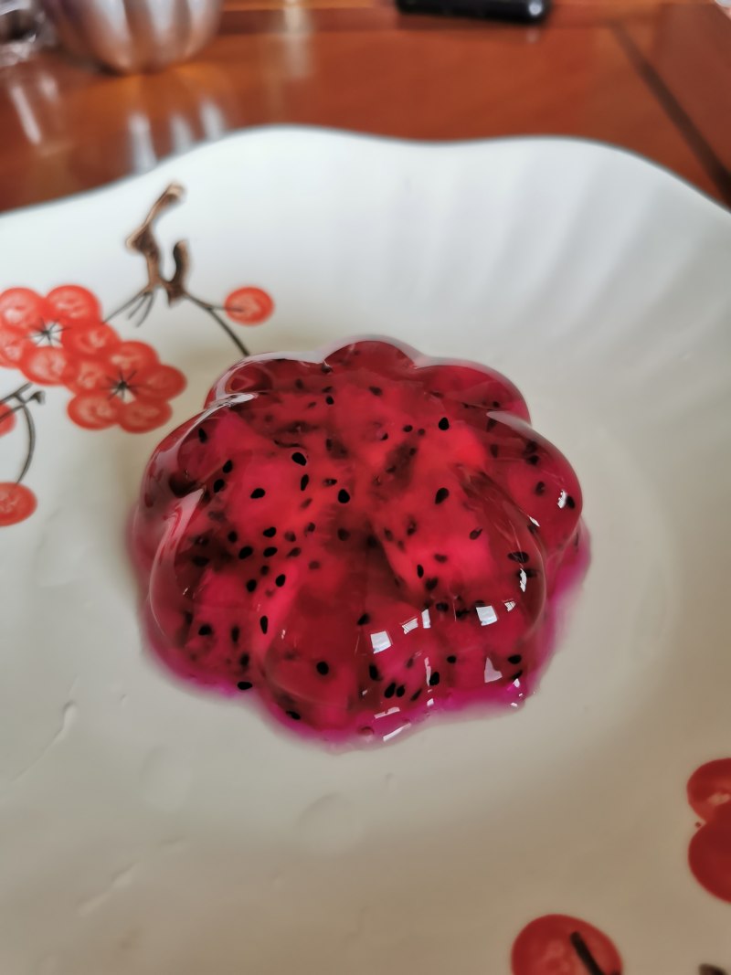 8:煮好的白凉粉挤入半个柠檬汁搅拌均匀,倒入模具,放入火龙果粒。