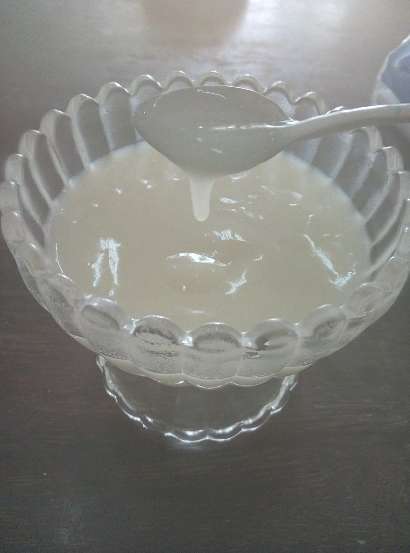 3:准备一把小勺,从饮水机里接开水,一边接水一边用小勺不停搅拌藕粉;随着水量的增加和温度的上升,藕粉变成了透明状的藕糊。