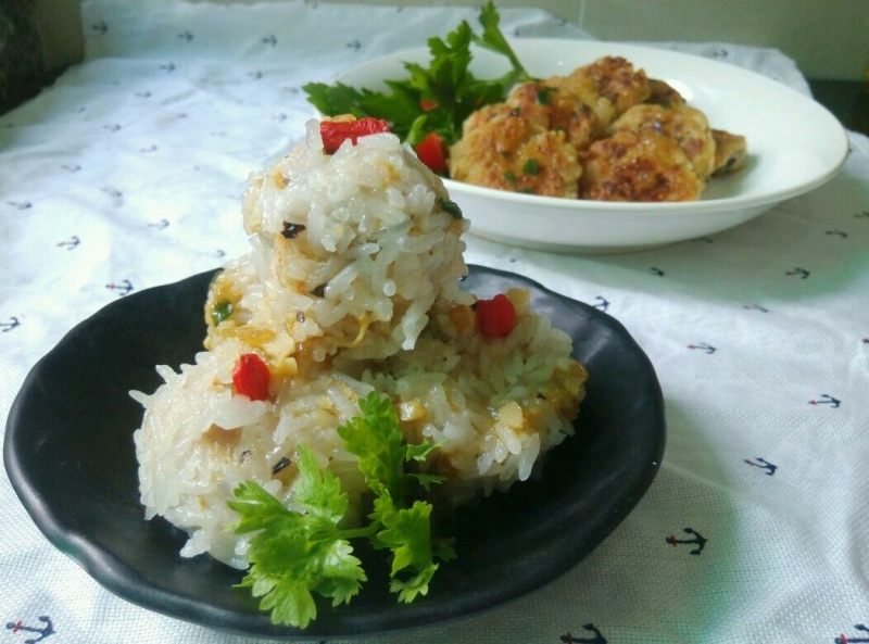 5:糯米饭包入肉馅,包成团状入锅慢火煎至金黄。