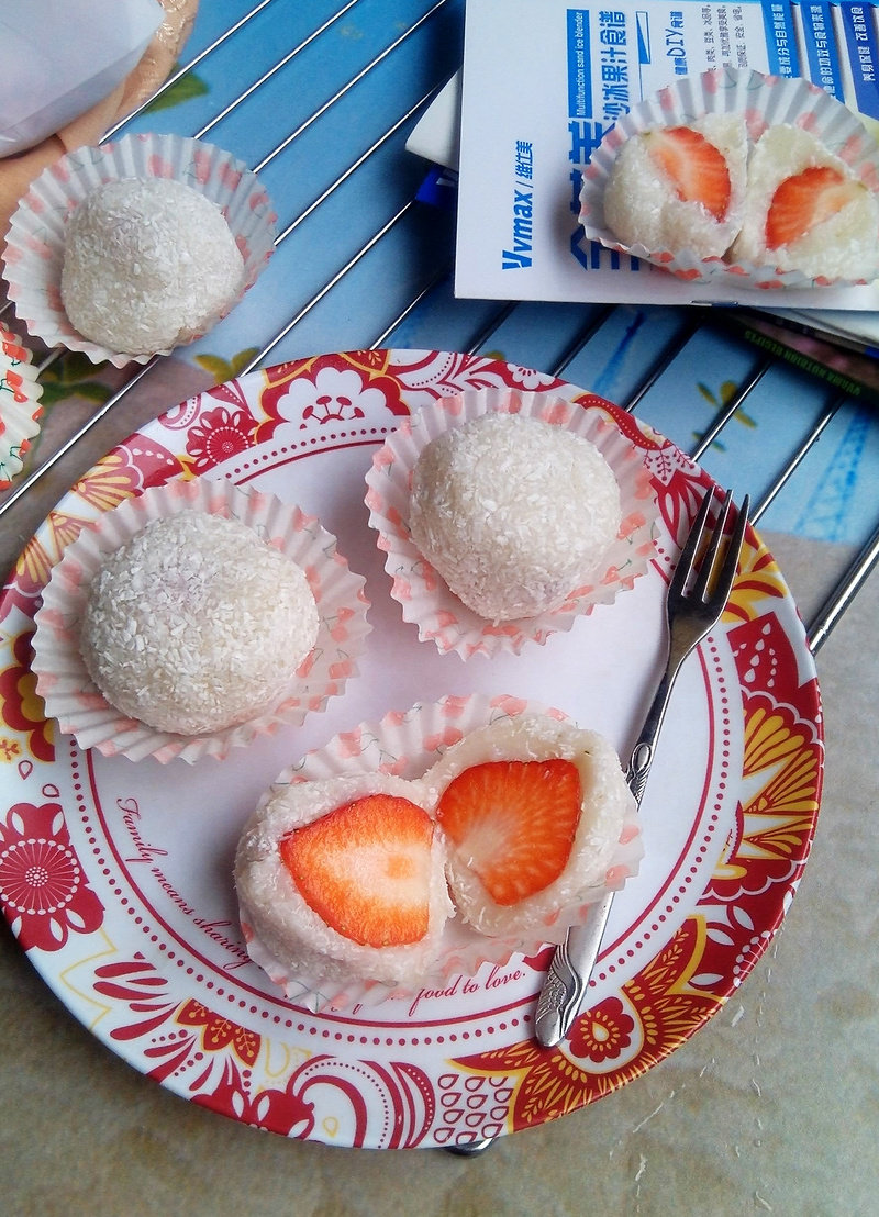 5:刚打好有点稀也很粘,可以过一会待糯米糊凉了再取就好多了,揪一团按扁包一个草莓