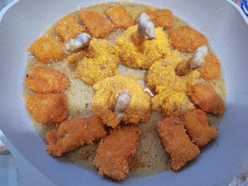 9:油温升高,炸至焦黄捞出(有一个没裹粉的)。