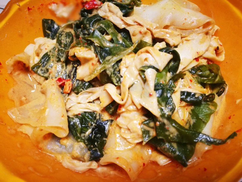 4:煮至宽粉将熟,放入豆腐皮和裙带菜,这两个菜好熟,稍微烫一会儿就可以了。