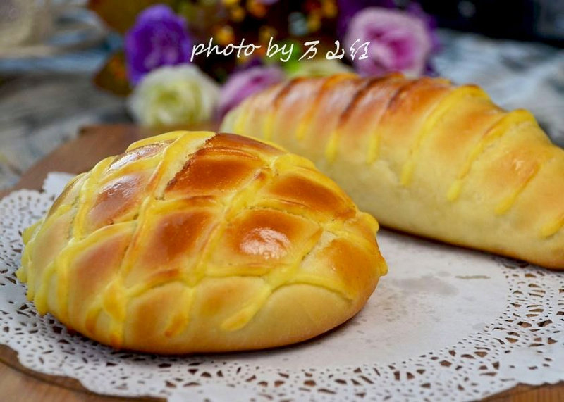 12:卡仕达酱装入裱花袋,袋口剪一个小口,挤到面包表面做装饰
