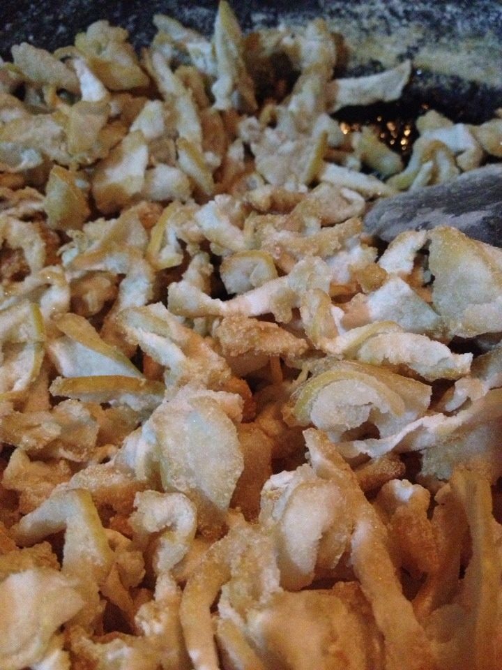 4:把柚子皮切成薄片,尽量薄一点,太厚的话糖粉不容易裹上