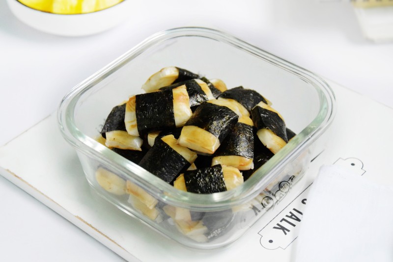 5:把包好海苔片的年糕摆烤网上,接口向下。