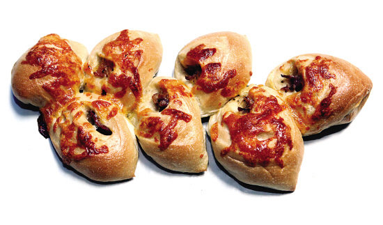 15:另一种花包的做法:将圆形面坯平均分成16等份,相邻的两个面块像拧麻花一样拧起来并捏合尾部即可,并在中心点装饰一个核桃。