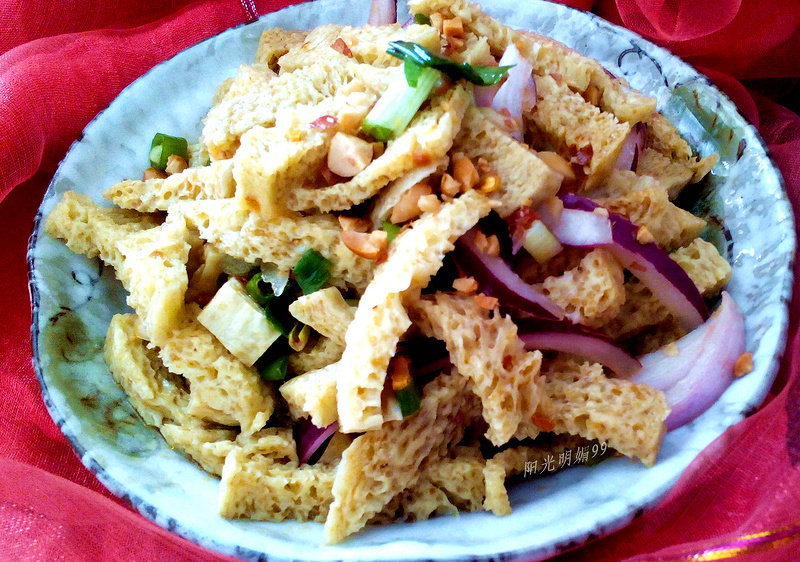 4:麻酱加水稀释,把所有调料加入面筋中,拌匀