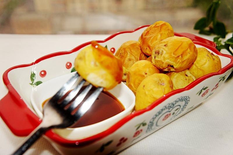 6:出炉,盘中倒入酸椒汁,微辣的口感,蘸酸椒汁吃特爽口,晚餐吃它最健康,低脂无油,想长胖都难。