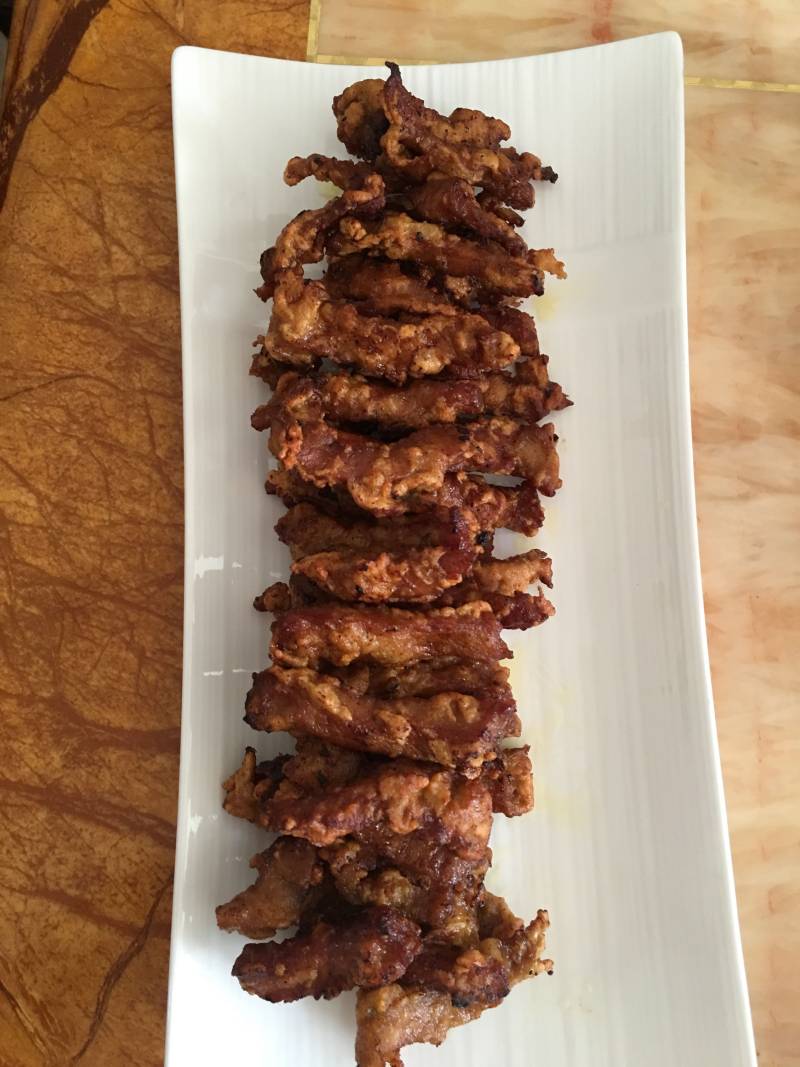 1:猪肉里脊切条,加辣椒粉、胡椒粉,花生油腌制2个小时。