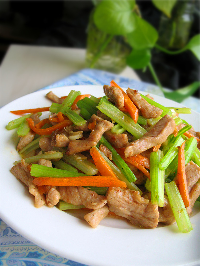 2:将猪里脊切丝、芹菜切小段、胡萝卜切丝。将里脊肉加入生抽、料酒、胡椒粉、花椒粉、白糖、淀粉抓匀腌制20分钟。