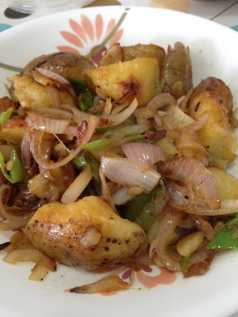 3:煸香配料,然后下土豆翻炒,加入盐和酱清即可!
