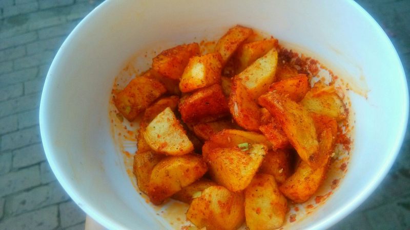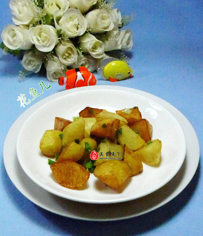 5:待到土豆块儿颜色快成金黄色时,在其表面均匀地撒盐,然后翻面,也撒上盐。