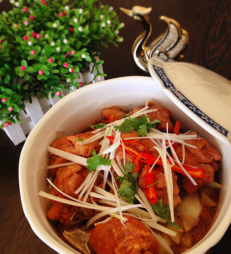 6:将最后的鸡块全部放在上面。择出大葱和姜片不要。