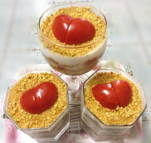 9:吃时再铺上一层饼干碎,再将圣女果切成心型放在上面装饰,早餐一杯很饱很营养