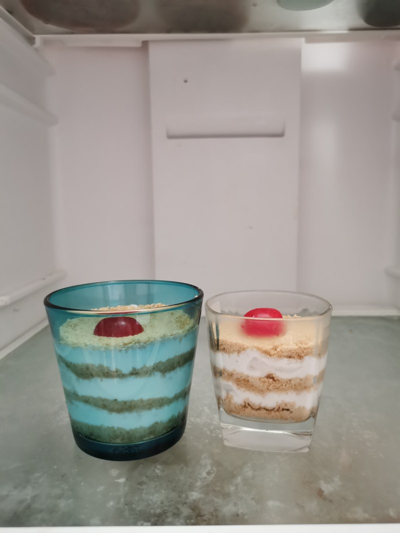 一个酸奶木糠杯中有2种口味,冷藏以后的效果不次于纯淡奶油的,但是热量更低。