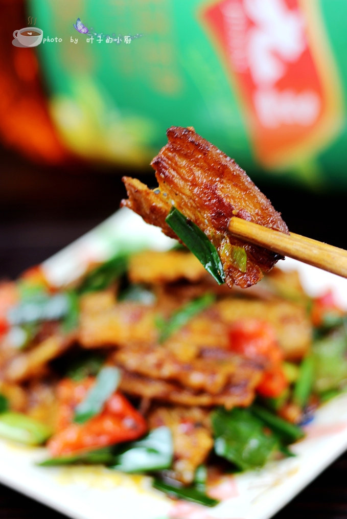 6:炒至肉微熟放一大勺豆瓣酱,少量味精或者鸡精,少量糖,豆瓣酱本来偏咸,烟熏肉也是咸的所以千万不要放盐了