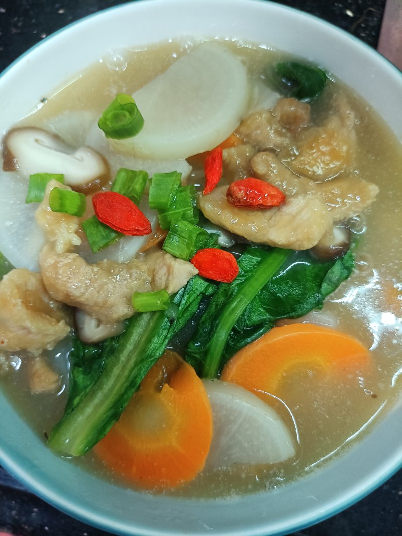12:起锅装碗(刚好一个人吃),撒上葱花,摆几颗枸杞,萝卜枸杞很搭的喲。