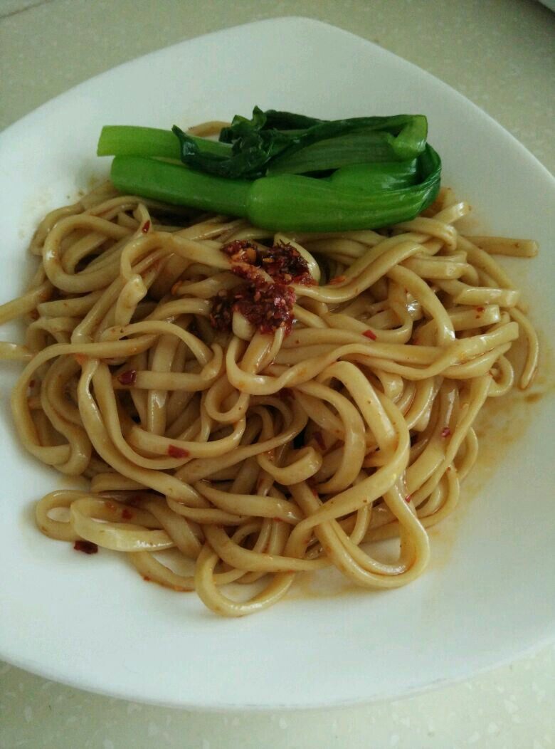 1:水煮滾后面条和青菜一起放入,待浮起后用冷开水冲洗,水滤掉放麻油拌匀