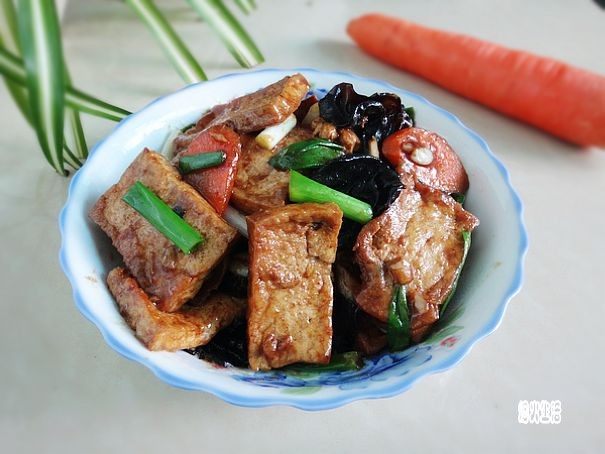 6:放入煎黄的豆腐、木耳和胡萝卜片翻炒均匀。