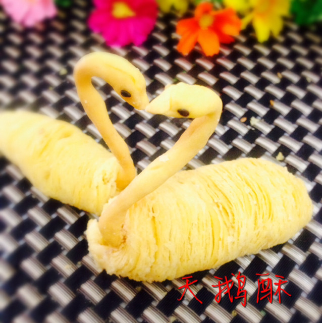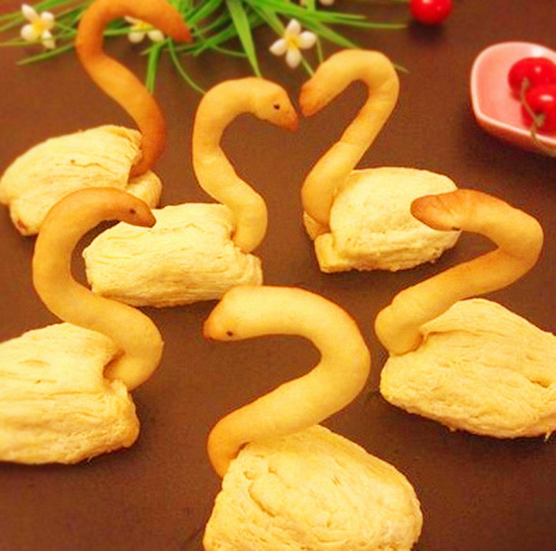 10:天鹅的脖子猪油20克,低粉50克,细砂糖8克,鸡蛋液8克,搅拌均匀,和成一个面团,揉成长条再做成脖子的样子。也可以把做身子切下的边角余料做脖子,就不用再费事和面了。用黑芝麻做眼睛。刷上蛋黄液,180度烤7分钟。