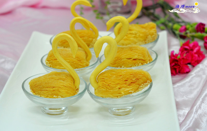 10:之后用牙签固定好,再同理作出另一个天鹅,用黑芝麻当做眼睛,撒上白糖就可以了!