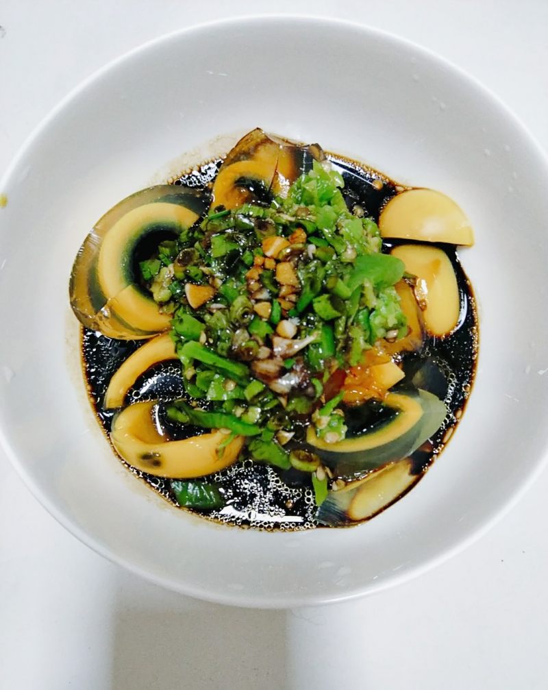 3:两颗皮蛋去皮辣椒加蒜末生抽醋香油。