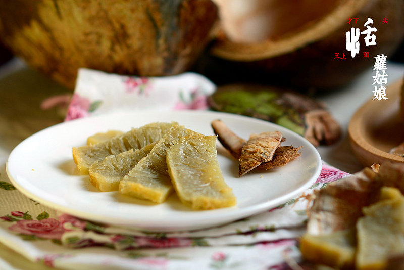 2:破开之后用勺子把里面的椰肉刮出来,加入180g椰子水研磨成椰浆