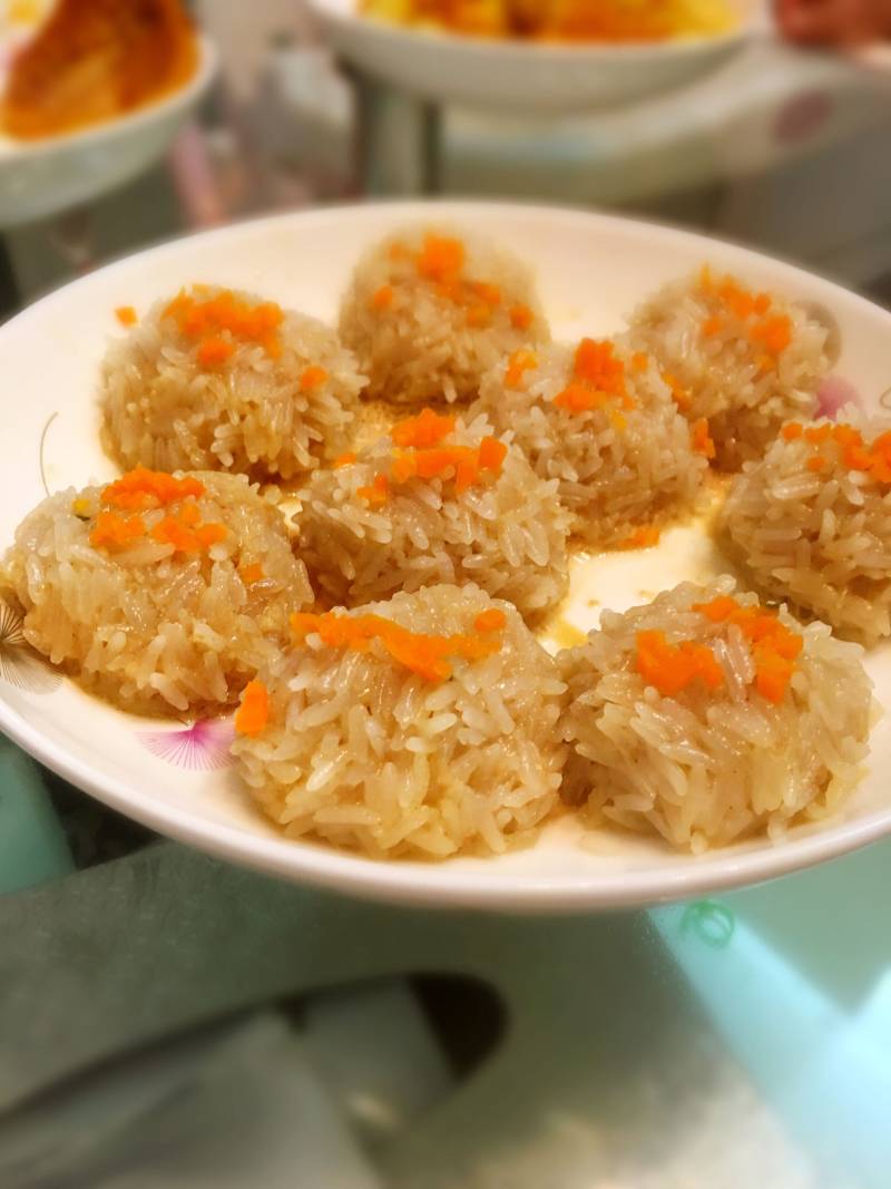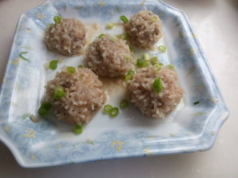 5:把调好的肉攒成一个丸子,然后放在糯米上滚一圈(糯米必须提前用水泡好至少5个小时),放在蒸锅上蒸至30分钟
